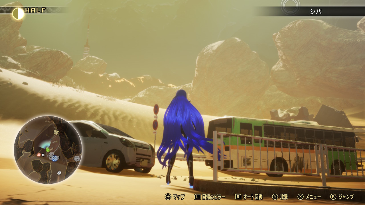 まず、ここで大感激。アトラスファンは、常に崩壊した3Dの東京を歩きたくて仕方がなく、歩きながらいつも脳内で壊れた街並を想像している(個人差があります)生き物ですが、サービスを終了したオンラインRPG「真・女神転生IMAGINE」以上にグッチャグチャに崩壊した東京を歩けます。ダアトと呼ばれる魔界化したトウキョウは、ビルのがれきと埋まった車、道路や歩道橋が散乱する混沌とした大地。悪魔たちが縄張りをつくり、自由気ままに生きるトウキョウを駆け巡り、飛び跳ね、探索を楽しめるのです。