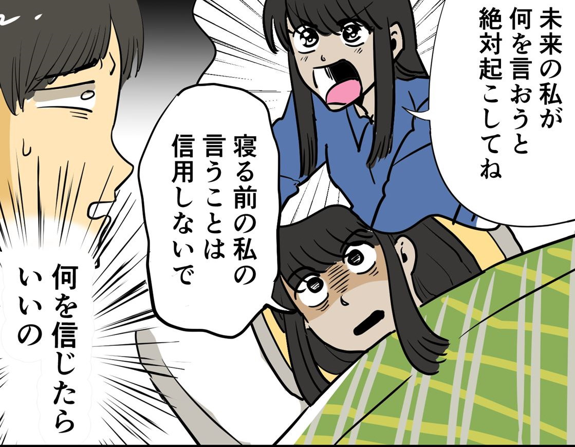 【その視点はなかった】「未来の私が何言っても起こして」「寝る前の私は信用しないで」 妻から背反するお願いをされてしまった人