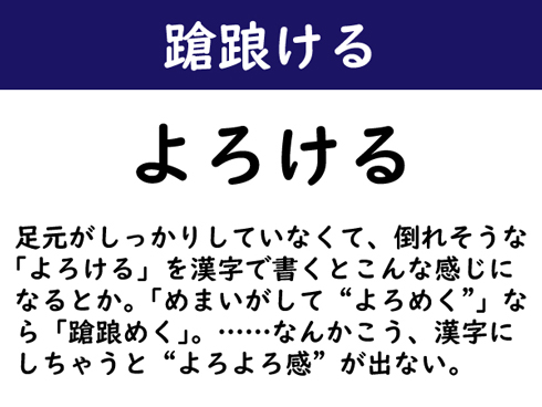 足元がしっかりしていなくて、倒れそうな「よろける」を漢字で書くとこんな感じになるとか。「めまいがして“よろめく”」なら「蹌踉めく」。……なんかこう、漢字にしちゃうと“よろよろ感”が出ない。