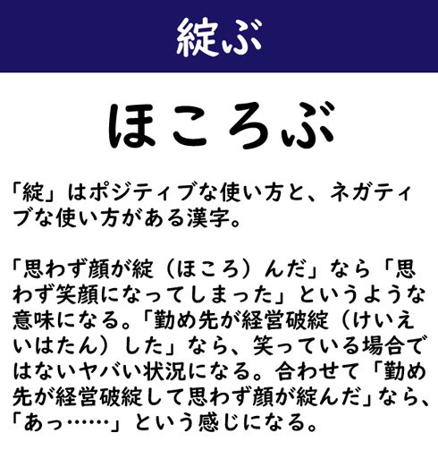 「綻」はポジティブな使い方と、ネガティブな使い方がある漢字。「思わず顔が綻(ほころ)んだ」なら「思わず笑顔になってしまった」というような意味になる。「勤め先が経営破綻(けいえいはたん)した」なら、笑っている場合ではないヤバい状況になる。合わせて「勤め先が経営破綻して思わず顔が綻んだ」なら、「あっ……」という感じになる。