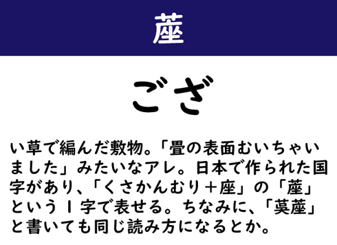 い草で編んだ敷物。「畳の表面むいちゃいました」みたいなアレ。日本で作られた国字があり、「くさかんむり+座」の「蓙」という1字で表せる。ちなみに、「茣蓙」と書いても同じ読み方になるとか。