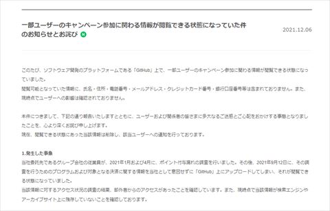 LINE Payは12月6日、一部ユーザーのキャンペーン参加情報が、ソフト開発プラットフォーム「GitHub」で閲覧できる状態になっていたと報告し、謝罪しました
