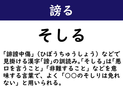 「誹謗中傷」(ひぼうちゅうしょう)などで見掛ける漢字「謗」の訓読み。「そしる」は「悪口を言うこと」「非難すること」などを意味する言葉で、よく「○○のそしりは免れない」と用いられる。