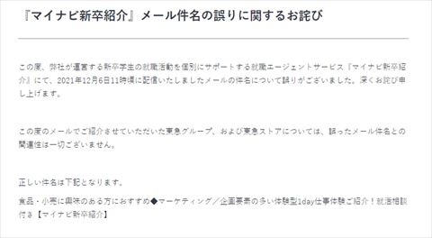 マイナビは、件名に誤りがあったとし、メール内で紹介した東急グループ、東急ストアには関連性は一切ないと説明。また当該メールは「マイナビ新卒紹介」登録者のうち首都圏在住者に送ったもので、所属の大学によって対応が変わるものではないとしています。