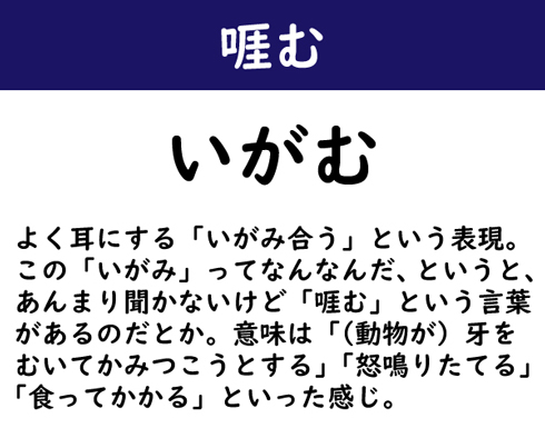 よく耳にする「いがみ合う」という表現。この「いがみ」ってなんなんだ、というと、あんまり聞かないけど「啀む」という言葉があるのだとか。意味は「(動物が)牙をむいてかみつこうとする」「怒鳴りたてる」「食ってかかる」といった感じ。