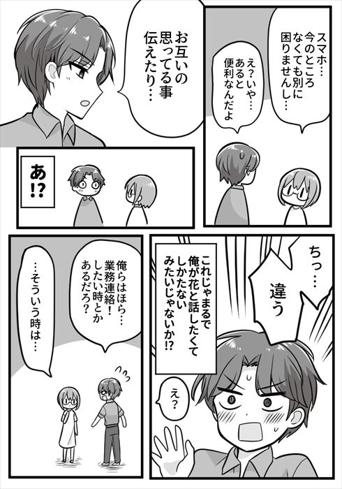 スマホは業務連絡に使えるから……とごまかす彼ですが、「そういう時は…私と直接…会話しませんか?」と真っ直ぐ花ちゃんに見つめられて真っ赤に。一瞬スマホはなくてもいいかもしれない、と思ってしまったのでした。