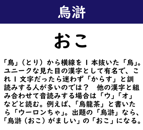 「鳥」(とり)から横線を1本抜いた「烏」。ユニークな見た目の漢字として有名で、これ1文字だったら迷わず「からす」と訓読みする人が多いのでは? 他の漢字と組み合わせて音読みする場合は「ウ」「オ」などと読む。例えば、「烏龍茶」と書いたら「ウーロンちゃ」。出題の「烏滸」なら、「烏滸(おこ)がましい」の「おこ」になる。