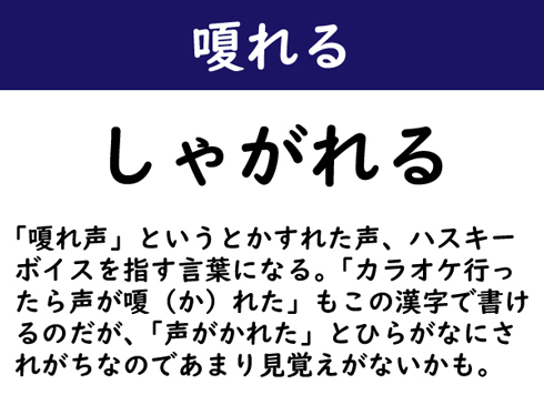 「嗄れ声」というとかすれた声、ハスキーボイスを指す言葉になる。「カラオケ行ったら声が嗄(か)れた」もこの漢字で書けるのだが、「声がかれた」とひらがなにされがちなのであまり見覚えがないかも。