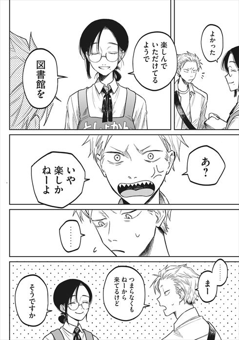ずいのさん 最初は、図書館に絶対来なさそうな人が来たら面白いかな!? としか考えてませんでした。その後、ヤンキーと図書館について真剣に考えてみると「貧困」でつながってるな……と気づきその後のお話を展開しました。ヤンキーと呼ばれる人々の背景の1つに貧困があり、公共図書館の役目のひとつが貧困による格差の解消なので。