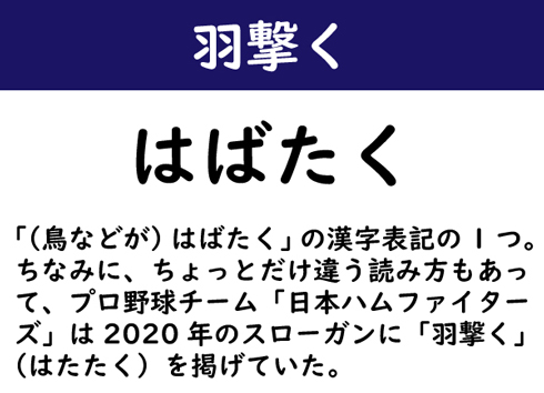 「(鳥などが)はばたく」の漢字表記の1つ。ちなみに、ちょっとだけ違う読み方もあって、プロ野球チーム「日本ハムファイターズ」は2020年のスローガンに「羽撃く」(はたたく)を掲げていた。