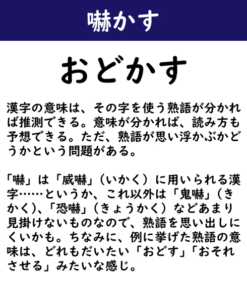 漢字の意味は、その字を使う熟語が分かれば推測できる。意味が分かれば、読み方も予想できる。ただ、熟語が思い浮かぶかどうかという問題がある。「嚇」は「威嚇」(いかく)に用いられる漢字……というか、これ以外は「鬼嚇」(きかく)、「恐嚇」(きょうかく)などあまり見掛けないものなので、熟語を思い出しにくいかも。ちなみに、例に挙げた熟語の意味は、どれもだいたい「おどす」「おそれさせる」みたいな感じ。