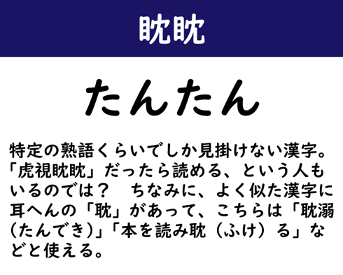 特定の熟語くらいでしか見掛けない漢字。「虎視眈眈」だったら読める、という人もいるのでは? ちなみに、よく似た漢字に耳へんの「耽」があって、こちらは「耽溺(たんでき)」「本を読み耽(ふけ)る」などと使える。
