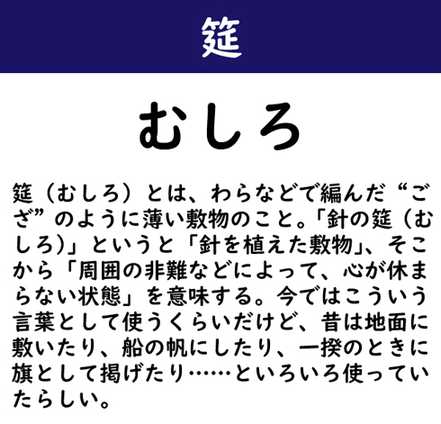 筵(むしろ)とは、わらなどで編んだ“ござ”のように薄い敷物のこと。「針の筵(むしろ)」というと「針を植えた敷物」、そこから「周囲の非難などによって、心が休まらない状態」を意味する。今ではこういう言葉として使うくらいだけど、昔は地面に敷いたり、船の帆にしたり、一揆のときに旗として掲げたり……といろいろ使っていたらしい。