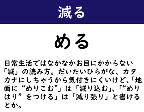 日常生活ではなかなかお目にかからない「減」の読み方。だいたいひらがな、カタカナにしちゃうから気付きにくいけど、「地面に“めりこむ”」は「減り込む」、「“めりはり”をつける」は「減り張り」と書けるとか。