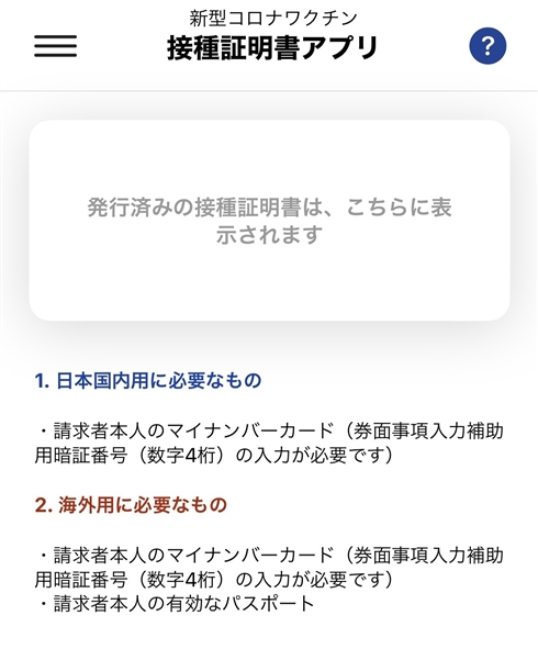 アプリでは政府が公式に提供する接種証明書を取得可能。利用にはマイナンバーカードと、マイナンバーカードの4桁の暗証番号のほか、海外用に発行する場合はパスポートも使用します。また、マイナンバーカードを読み取るためスマートフォンが「NFC Type B」に対応している必要があります。