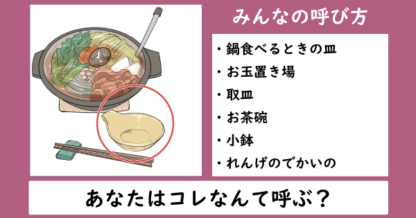 身近なところに潜んでいる、見たことはあるけど名前がよく分からないモノ。それの「みんなの呼び方」「正式名称」を調査する企画。今回のテーマは、居酒屋で鍋料理を注文したときなどに出てきて、フチの一部が出っ張っている小さい器の名前です。