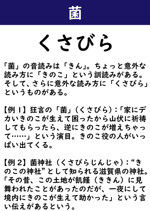 「菌」の音読みは「きん」。ちょっと意外な読み方に「きのこ」という訓読みがある。そして、さらに意外な読み方に「くさびら」というものがある。【例1】狂言の「菌」(くさびら):「家にデカいきのこが生えて困ったから山伏に祈祷してもらったら、逆にきのこが増えちゃって……」という演目。きのこ役の人がいっぱい出てくる。【例2】菌神社(くさびらじんじゃ):“きのこの神社”として知られる滋賀県の神社。「その昔、この土地が飢饉(ききん)に見舞われたことがあったのだが、一夜にして境内にきのこが生えて助かった」という言い伝えがあるという。