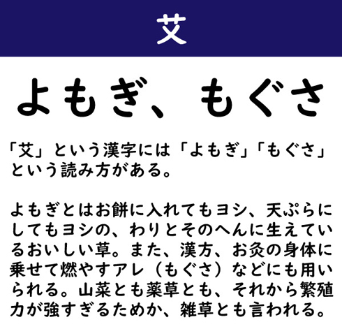 「艾」という漢字には「よもぎ」「もぐさ」という読み方がある。よもぎとはお餅に入れてもヨシ、天ぷらにしてもヨシの、わりとそのへんに生えているおいしい草。漢方、お灸の身体に乗せて燃やすアレ(もぐさ)などにも用いられる。山菜とも薬草とも、それから繁殖力が強すぎるためか、雑草とも言われる。