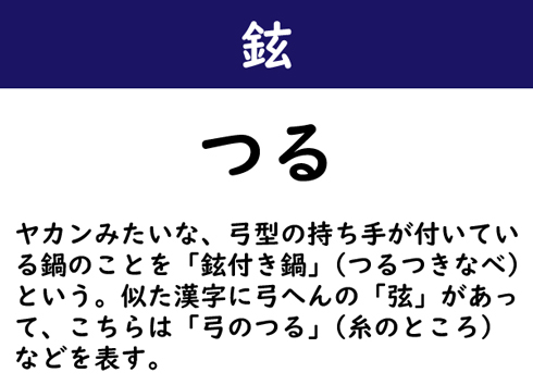 ヤカンみたいな、弓型の持ち手が付いている鍋のことを「鉉付き鍋」(つるつきなべ)という。似た漢字に弓へんの「弦」があって、こちらは「弓のつる」(糸のところ)などを表す。