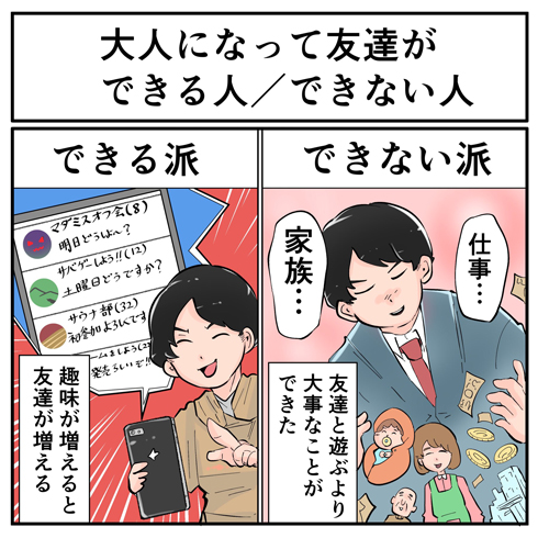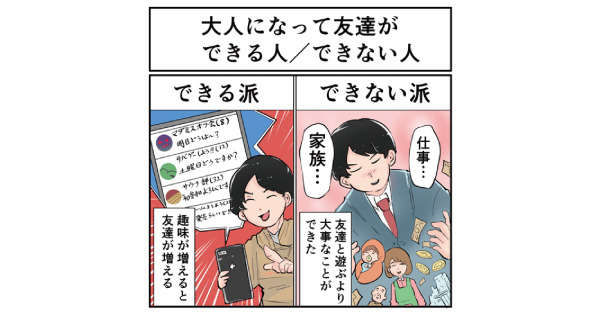 身も蓋もない話ではありますが、「大人になると友達ができなくなるかどうかは、人それぞれ。というか、子どものころに友達ができるかどうかも人それぞれ」というのが結論なのかもしれません。