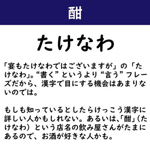 「宴もたけなわではございますが」の「たけなわ」。“書く”というより“言う”フレーズだから、漢字で目にする機会はあまりないのでは。もしも知っているとしたらけっこう漢字に詳しい人かもしれない。あるいは、「酣」(たけなわ)という店名の飲み屋さんがたまにあるので、お酒が好きな人かも。