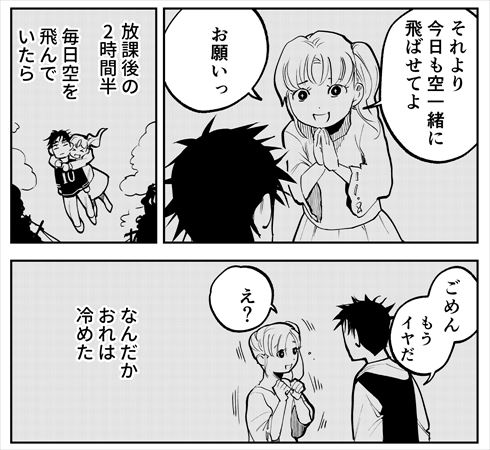他のお願いにすればよかったと悔やむ大介ですが、やがて同じ高校のユリと付き合い始め、その気持ちも変わります。自分から飛びたいとは言わないけれど、一緒に飛ぶといつも喜んでくれるユリ。彼女の笑顔に「空を飛べていいことあったよ」と思う大介ですが、その矢先に飛べなくなってしまいます。悲壮感を漂わせながら、もう飛べなくなったと告げる大介に、ユリは――。