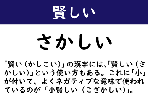 「賢い(かしこい)」の漢字には、「賢しい(さかしい)」という使い方もある。これに「小」が付いて、よくネガティブな意味で使われているのが「小賢しい(こざかしい)」。