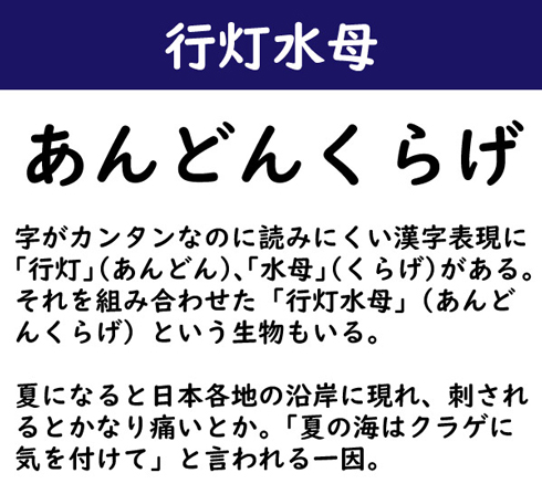 字がカンタンなのに読みにくい漢字表現に「行灯」(あんどん)、「水母」(くらげ)がある。それを組み合わせた「行灯水母」(あんどんくらげ)という生物もいる。夏になると日本各地の沿岸に現れ、刺されるとかなり痛いとか。「夏の海はクラゲに気を付けて」と言われる一因。
