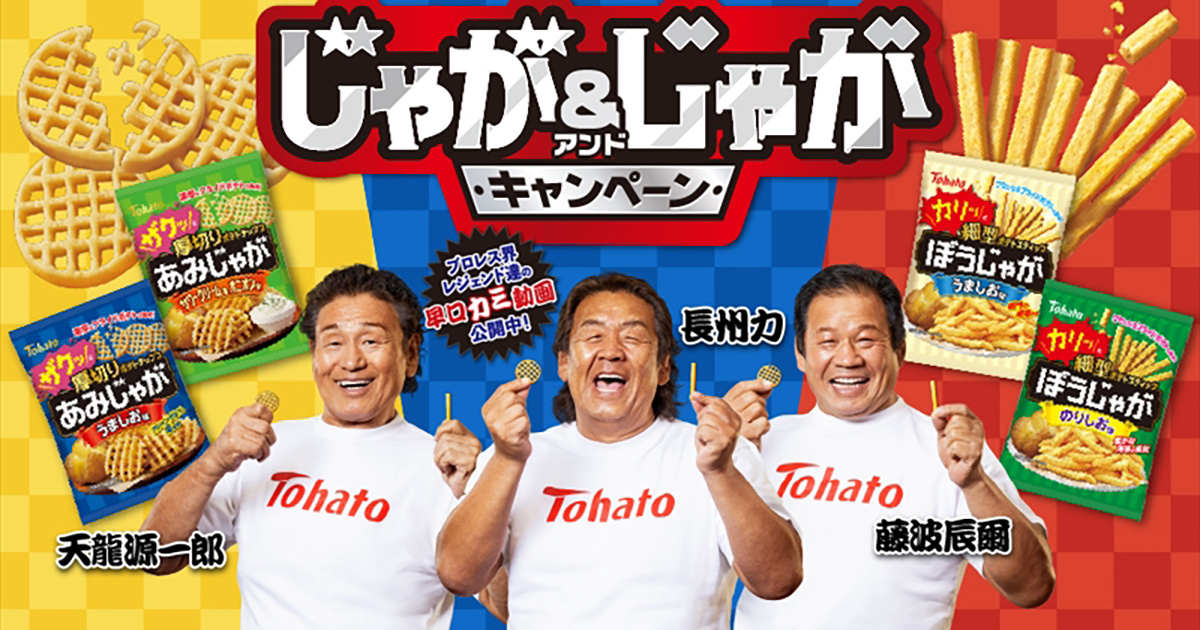 プロレス界のレジェンドである長州力さん、天龍源一郎さん、藤波辰爾さんが、スナック菓子「あみじゃが」(株式会社東ハト)のキャンペーン動画に登場。「あみじゃが」にちなんだ早口言葉に挑戦しており、多くの強敵を倒してきた“大きくて強いおじさん”たちが愛おしいほどに大苦戦しています。