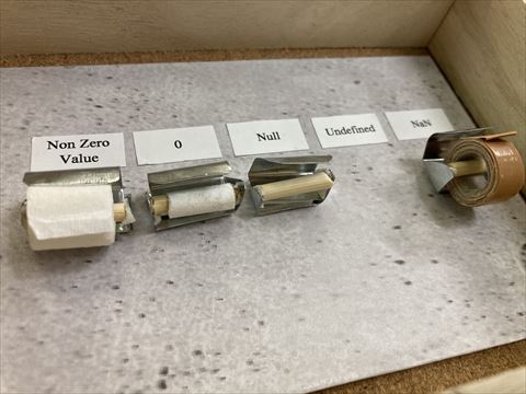 • Undefined(未定義):トイレットペーパーが入るための器(データ型)がない(未定義なので、そこにトイレットペーパーを入れる先がない)