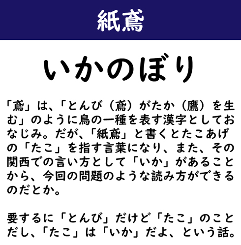 「鳶」は、「とんび(鳶)がたか(鷹)を生む」のように鳥の一種を表す漢字としておなじみ。だが、「紙鳶」と書くとたこあげの「たこ」を指す言葉になり、また、その関西での言い方として「いか」があることから、今回の問題のような読み方ができるのだとか。要するに「とんび」だけど「たこ」のことだし、「たこ」は「いか」だよ、という話。