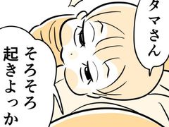 「タマさん そろそろ起きよっか」と声をかけるママ。しかし、タマちゃんはぼんやりと目を開けるもののなかなか起きません。