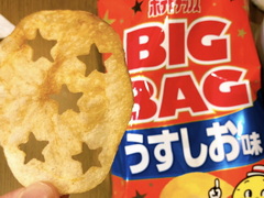 この星型に抜かれているチップスが見つかったのはカルビーの「ポテトチップス うすしお味 BIGBAG」。鹿児島で購入したもので、何百袋と食べてきたけど初めて見たと岩崎さんがコメントしているとおり、本来ならば市場に流通しないものでした。