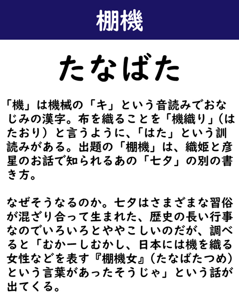 「機」は機械の「キ」という音読みでおなじみの漢字。布を織ることを「機織り」(はたおり)と言うように、「はた」という訓読みがある。出題の「棚機」は、織姫と彦星のお話で知られるあの「七夕」の別の書き方。なぜそうなるのか。七夕はさまざまな習俗が混ざり合って生まれた、歴史の長い行事なのでいろいろとややこしいのだが、調べると「むかーしむかし、日本には機を織る女性などを表す『棚機女』(たなばたつめ)という言葉があったそうじゃ」という話が出てくる。