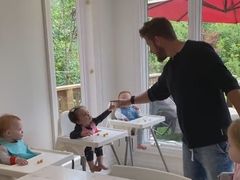 動画が撮影された場所はカナダ。1歳になる三つ子の赤ちゃんたちと2歳の女の子のランチタイム中に、パパさんが子どもたちを楽しませています。