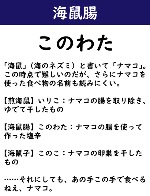 「海鼠」(海のネズミ)と書いて「ナマコ」。この時点で難しいのだが、さらにナマコを使った食べ物の名前も読みにくい。【煎海鼠】いりこ:ナマコの腸を取り除き、ゆでて干したもの。【海鼠腸】このわた:ナマコの腸を使って作った塩辛。【海鼠子】このこ:ナマコの卵巣を干したもの。……それにしても、あの手この手で食べるねえ、ナマコ。