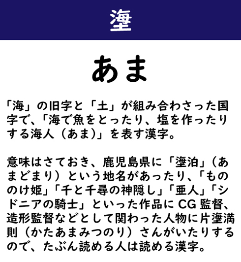「海」の旧字と「土」が組み合わさった国字で、「海で魚をとったり、塩を作ったりする海人(あま)」を表す漢字。意味はさておき、鹿児島県に「塰泊」(あまどまり)という地名があったり、「もののけ姫」「千と千尋の神隠し」「亜人」「シドニアの騎士」といった作品にCG監督、造形監督などとして関わった人物に片塰満則(かたあまみつのり)さんがいたりするので、たぶん読める人は読める漢字。