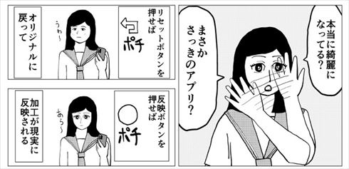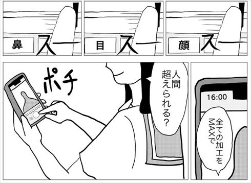 「私を現実で綺麗にして」。自分の容姿に不満を持つ主人公・山田に指示され、スマホのアシスタントが検索で見つけたのは「現実反映アプリ」。早速使ってみた山田は、鏡を見て自分の顔が“加工後”になっていることに気付きます。
