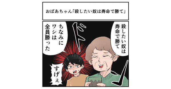 何十年、時には百年を超える人生の道のり。人間関係がずっとうまくいくとは限りません。殺意を覚えるほどに憎んでしまうことだってありえます。ですが、それに対し、長生きしてきたからこそ言えるおばあちゃんの言葉は「殺したい奴は寿命で勝て」というもの。そして、すでに「全員に勝った」とか。