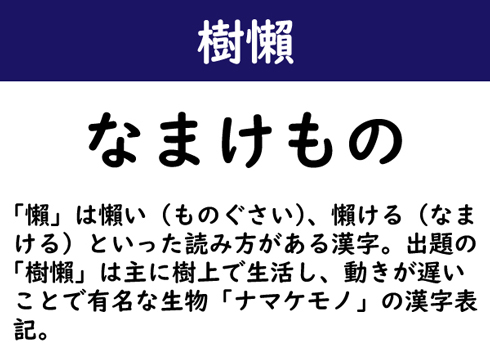 「懶」は懶い(ものぐさい)、懶ける(なまける)といった読み方がある漢字。出題の「樹懶」は主に樹上で生活し、動きが遅いことで有名な生物「ナマケモノ」の漢字表記。
