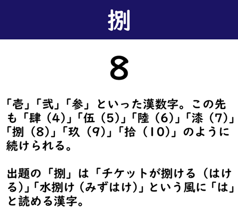 「壱」「弐」「参」といった漢数字。この先も「肆(4)」「伍(5)」「陸(6)」「漆(7)」「捌(8)」「玖(9)」「拾(10)」のように続けられる。出題の「捌」は「チケットが捌ける(はける)」「水捌け(みずはけ)」という風に「は」と読める漢字。