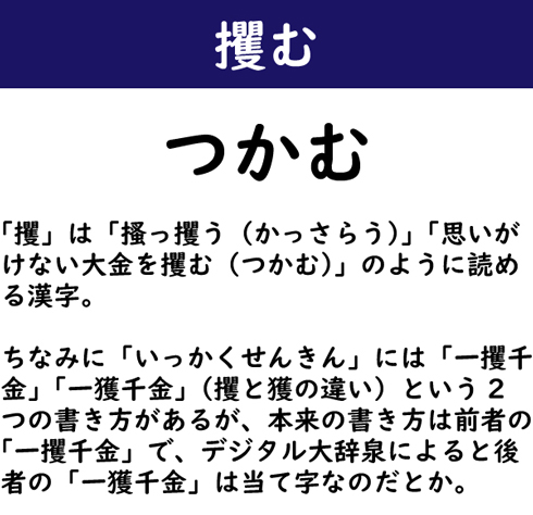「攫」は「搔っ攫う(かっさらう)」「思いがけない大金を攫む(つかむ)」のように読める漢字。ちなみに「いっかくせんきん」には「一攫千金」「一獲千金」(攫と獲の違い)という2つの書き方があるが、本来の書き方は前者の「一攫千金」で、デジタル大辞泉によると後者の「一獲千金」は当て字なのだとか。
