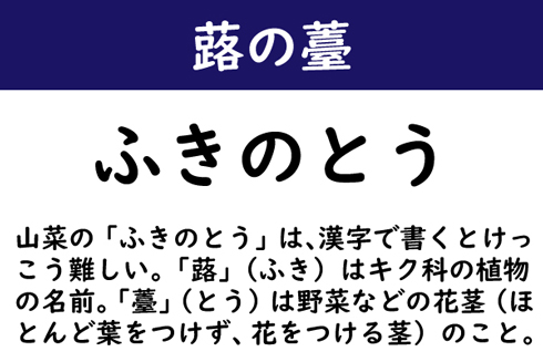 山菜の「ふきのとう」は、漢字で書くとけっこう難しい。「蕗」(ふき)はキク科の植物の名前。「薹」(とう)は野菜などの花茎(ほとんど葉をつけず、花をつける茎)のこと。