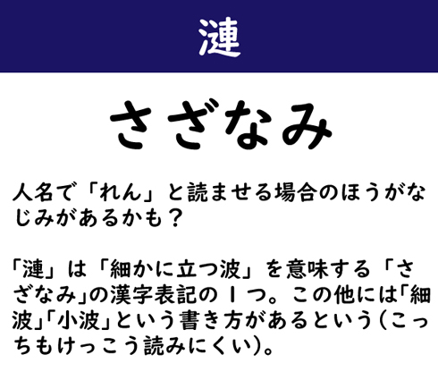 人名で「れん」と読ませる場合のほうがなじみがあるかも? 「漣」は「細かに立つ波」を意味する「さざなみ」の漢字表記の1つ。この他には「細波」「小波」という書き方があるという(こっちもけっこう読みにくい)。