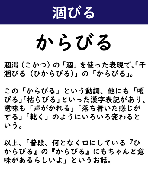 涸渇(こかつ)の「涸」を使った表現で、「干涸びる(ひからびる)」の「からびる」。この「からびる」という動詞、他にも「嗄びる」「枯らびる」といった漢字表記があり、意味も「声がかれる」「落ち着いた感じがする」「乾く」のようにいろいろ変わるという。以上、「普段、何となく口にしている『ひからびる』の『からびる』にもちゃんと意味があるらしいよ」というお話。