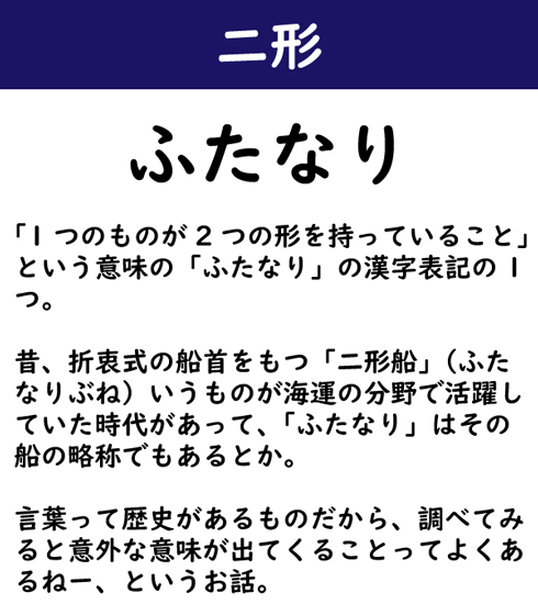 「1つのものが2つの形を持っていること」という意味の「ふたなり」の漢字表記の1つ。昔、折衷式の船首をもつ「二形船」(ふたなりぶね)いうものが海運の分野で活躍していた時代があって、「ふたなり」はその船の略称でもあるとか。言葉って歴史があるものだから、調べてみると意外な意味が出てくることってよくあるねー、というお話。