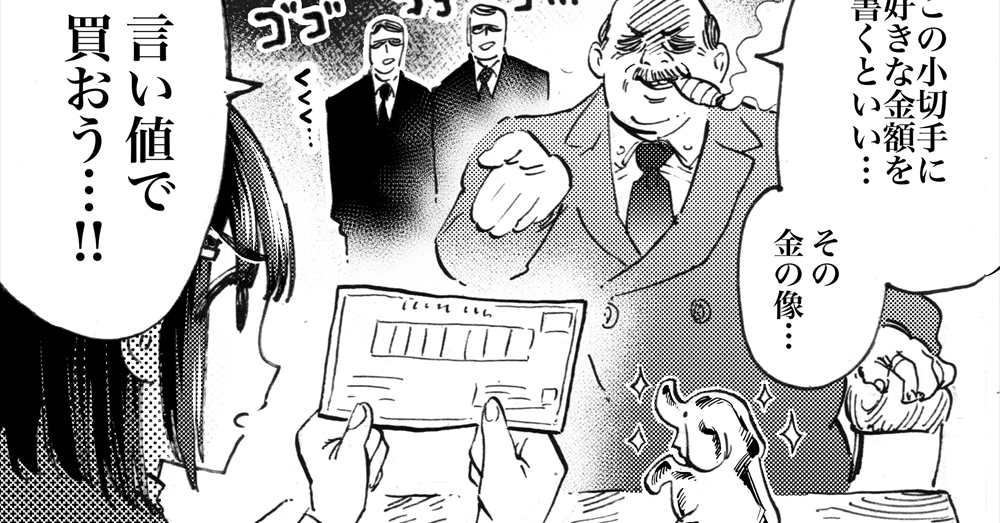 大富豪はその金の象の像をいたく気に入り、「この小切手に好きな金額を書くといい…その金の像…言い値で買おう…!」と葉巻をくゆらせます。