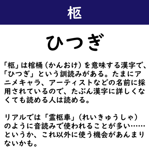 「柩」は棺桶(かんおけ)を意味する漢字で、「ひつぎ」という訓読みがある。たまにアニメキャラ、アーティストなどの名前に採用されているので、たぶん漢字に詳しくなくても読める人は読める。リアルでは「霊柩車」(れいきゅうしゃ)のように音読みで使われることが多い……というか、これ以外に使う機会があんまりないかも。