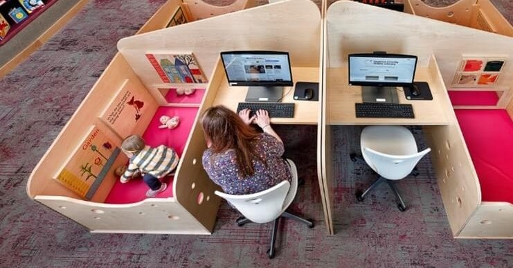 ブースは、パーティションで囲ったPCデスクのすぐ横に、子どもが遊べるスペースがくっついたもの。PCで作業しながら、すぐそばで子どもを遊ばせることができます。同州ヘンリコ郡にある公共図書館で導入されたこのブースを、来館者が「こんなの見たことない」とTwitterに投稿すると、「興味深いイノベーション」「思慮に富んでいる」と反響がありました。