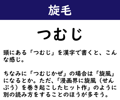 頭にある「つむじ」を漢字で書くと、こんな感じ。ちなみに「つむじかぜ」の場合は「旋風」になるとか。ただ、「漫画界に旋風(せんぷう)を巻き起こしたヒット作」のように別の読み方をすることのほうが多そう。